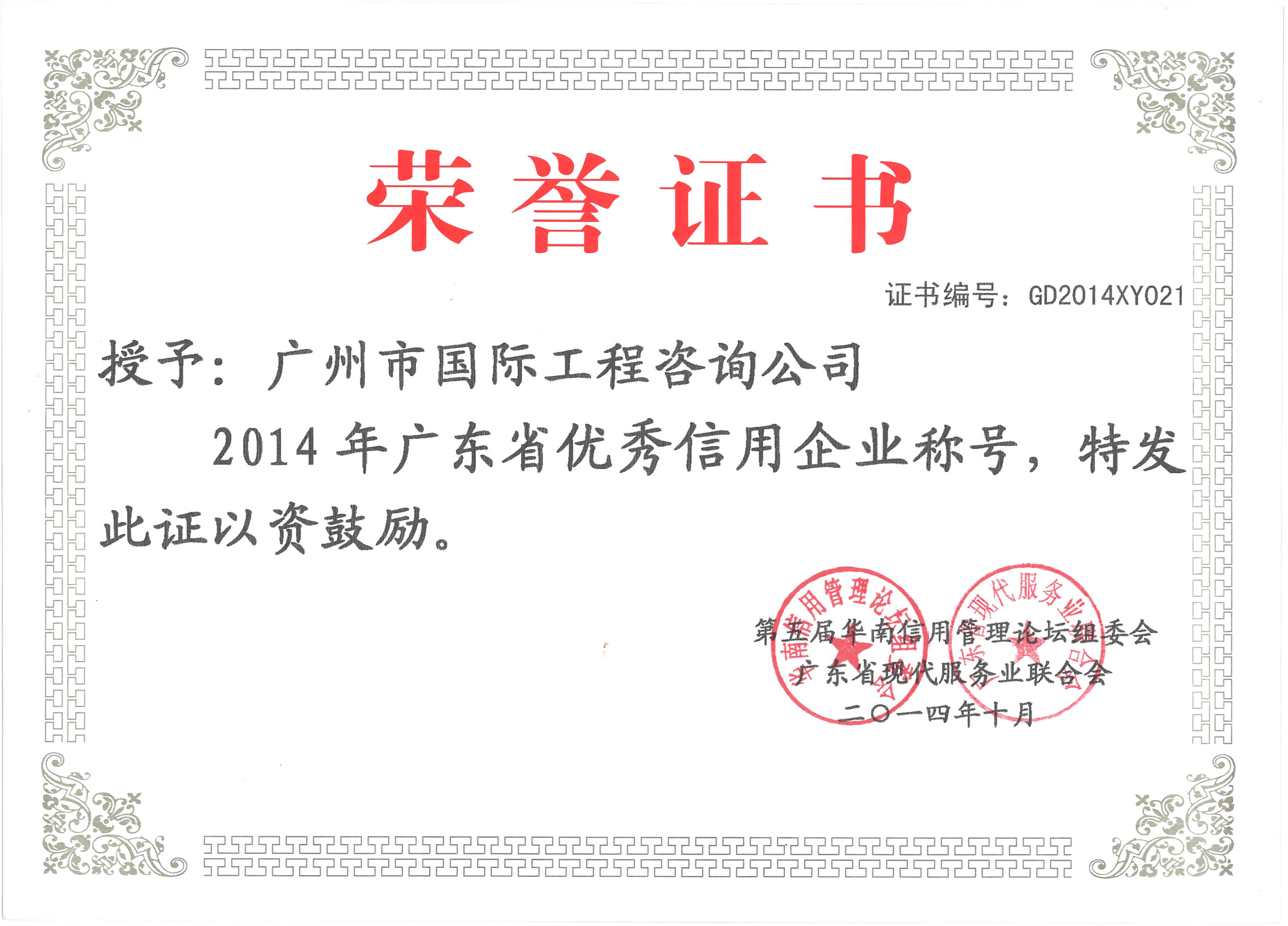 2014年(nián)廣東省優秀信用企業(yè)