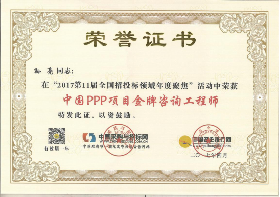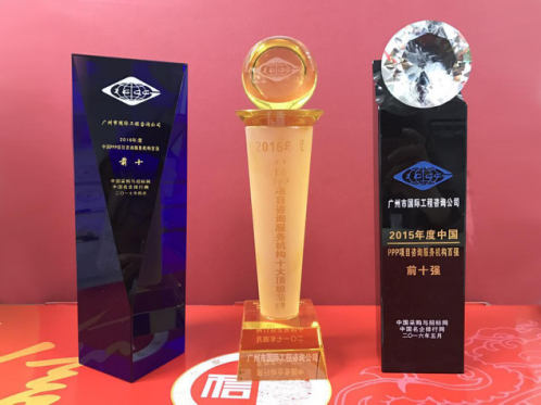 為(wèi)在PPP咨詢行業(yè)内樹立标杆企業(yè),國(guó)家發改委中國(guó)投資協會(huì)項目投融資專業(yè)委員(yuán)會(huì)、中國(guó)采購與招标網、中國(guó)名企排行網聯合主辦了“第10、11屆PPP咨詢服務機(jī)構評價推薦”活動。秉承“公開(kāi)、公平、公正、誠實信用”的原則,最終遴選出年(nián)度中國(guó)PPP咨詢服務機(jī)構類大獎。在活動中,廣州市(shì)國(guó)際工(gōng)程咨詢公司榮獲“2015、2016年(nián)度中國(guó)PPP項目咨詢服務機(jī)構百強(前十強)”,”2016年(nián)度中國(guó)PPP項目咨詢服務機(jī)構十大頂級品牌”、”2016年(nián)度中國(guó)PPP項目咨詢服務最佳智庫獎”、”2015年(nián)度廣東省PPP項目咨詢服務機(jī)構首選品牌”、”2015年(nián)度市(shì)政基礎設施PPP項目咨詢服務機(jī)構首選品牌”等集體榮譽類大獎。此外,公司PPP項目咨詢中心主任肖桃生(shēng)、副主任盧世君、陳偉雄、孫亮分别榮獲2015、2016年(nián)度中國(guó)PPP項目金牌咨詢工(gōng)程師(shī)稱号。