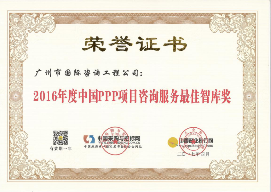廣州市(shì)國(guó)際工(gōng)程咨詢公司已連續兩年(nián),蟬聯年(nián)度中國(guó)PPP項目咨詢服務機(jī)構十大頂級品牌等獎項。