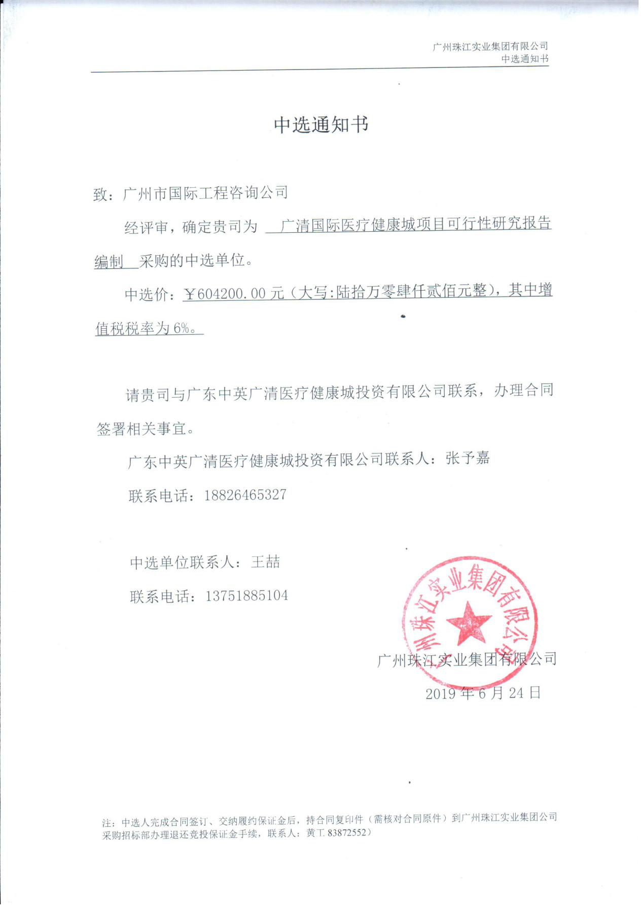 6月(yuè)19日,廣州珠江實業(yè)集團有限公司對廣清國(guó)際醫(yī)療健康城(chéng)項目可行性研究報(bào)告采購進行邀請招标,經評委評審,确定廣州市(shì)國(guó)際工(gōng)程咨詢公司為(wèi)該項目的中選單位。