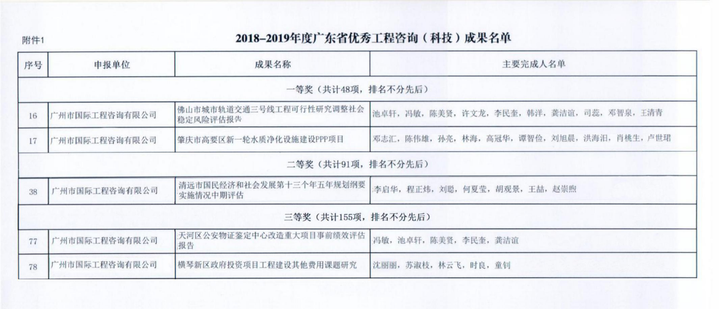 近日,廣東省工(gōng)程咨詢協會(huì)公布了2018-2019年(nián)度廣東省優秀工(gōng)程咨詢(科技(jì))成果獎,經單位申報(bào)、廣東省優秀工(gōng)程咨詢(科技(jì))成果專家評審和評審委員(yuán)會(huì)審定,廣州助美咨詢有限公司申報(bào)的5個(gè)項目獲得了2018-2019年(nián)度廣東省優秀工(gōng)程咨詢(科技(jì))成果獎,分别是:《佛山市(shì)城(chéng)市(shì)軌道交通(tōng)三号線工(gōng)程可行性研究調整社會(huì)穩定風險評估報(bào)告》《肇慶市(shì)高(gāo)要區新一(yī)輪水(shuǐ)質淨化設施建設PPP項目》榮獲2018-2019年(nián)度廣東省優秀工(gōng)程咨詢(科技(jì))成果獎一(yī)等獎;《清遠(yuǎn)市(shì)國(guó)民(mín)經濟和社會(huì)發展第十三個(gè)年(nián)五年(nián)規劃綱要實施情況中期評估》榮獲2018-2019年(nián)度廣東省優秀工(gōng)程咨詢(科技(jì))成果獎二等獎;《天河區公安物(wù)證鑒定中心改造重大項目事(shì)前績效評估報(bào)告》《橫琴新區政府投資項目工(gōng)程建設其他費(fèi)用課題研究》榮獲2018-2019年(nián)度廣東省優秀工(gōng)程咨詢(科技(jì))成果獎三等獎。