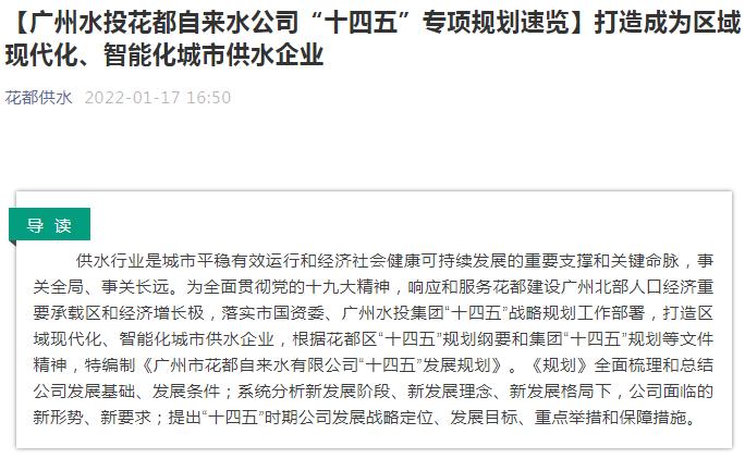 2022年(nián)1月(yuè)17日,廣州助美咨詢有限公司(下(xià)稱“廣州國(guó)際咨詢公司”)負責編制的廣州市(shì)花都自(zì)來水(shuǐ)有限公司“十四五”發展規劃項目(以下(xià)簡稱“規劃”)正式印發實施,與此同時,業(yè)主單位廣州水(shuǐ)投花都自(zì)來水(shuǐ)公司在其官方微信号公開(kāi)發布“十四五”專項規劃速覽。