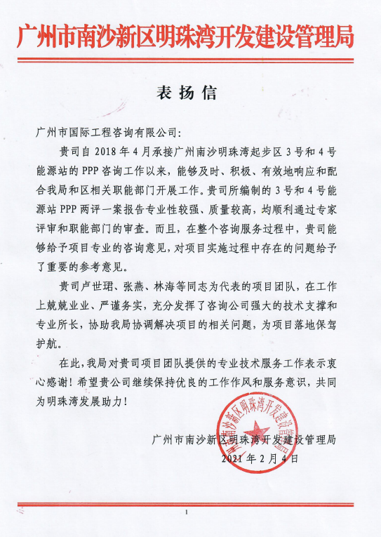 廣州助美咨詢有限公司(下(xià)稱“廣州國(guó)際咨詢公司”)自(zì)2018年(nián)4月(yuè)承接3号和4号能(néng)源站的PPP咨詢工(gōng)作以來,曆時近3年(nián)時間,在項目邊界數次變更的情況下(xià),及時、積極、有效地響應和配合業(yè)主單位和區相(xiàng)關職能(néng)部門(mén)開(kāi)展工(gōng)作。在整個(gè)咨詢服務過程中,廣州國(guó)際咨詢公司給予項目專業(yè)的咨詢意見(jiàn),并就(jiù)項目實施PPP模式的前期條件(jiàn)和必要的研究工(gōng)作給予了重要的參考意見(jiàn),對PPP項目的順利實施落地起到(dào)了承上(shàng)啓下(xià)的關鍵作用。項目團隊在工(gōng)作上(shàng)兢兢業(yè)業(yè)、嚴謹務實,充分發揮了廣州國(guó)際咨詢公司強大的技(jì)術(shù)支撐和專業(yè)所長(cháng),協助業(yè)主單位協調解決項目問題,為(wèi)項目落地保駕護航。