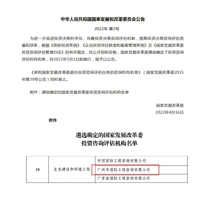 2022年(nián)4月(yuè)28日,國(guó)家發展委公布了《遴選确定的國(guó)家發展改革委投資咨詢評估機(jī)構名單》(中華人民(mín)共和國(guó)國(guó)家發展和改革委員(yuán)會(huì)公告2022年(nián)第3号),廣州助美咨詢有限公司(以下(xià)簡稱“廣州國(guó)際咨詢公司”)成功入選“生(shēng)态建設和環境工(gōng)程專業(yè)”3家投資咨詢評估機(jī)構之一(yī)。本次遴選共涉及19個(gè)專業(yè),全國(guó)範圍内共有37家咨詢機(jī)構入選。廣州國(guó)際咨詢公司是入選單位中少數幾家地方性咨詢機(jī)構之一(yī)。